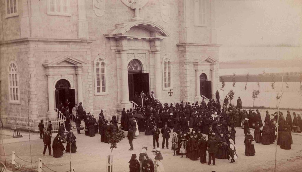 La sortie de la messe à la basilique de Sainte-Anne-de-Beaupré, [vers 1900], Archives nationales à Québec, Fonds J. E. Livernois Ltée, (03Q,P560,S1,P1154), Photographe non identifié.