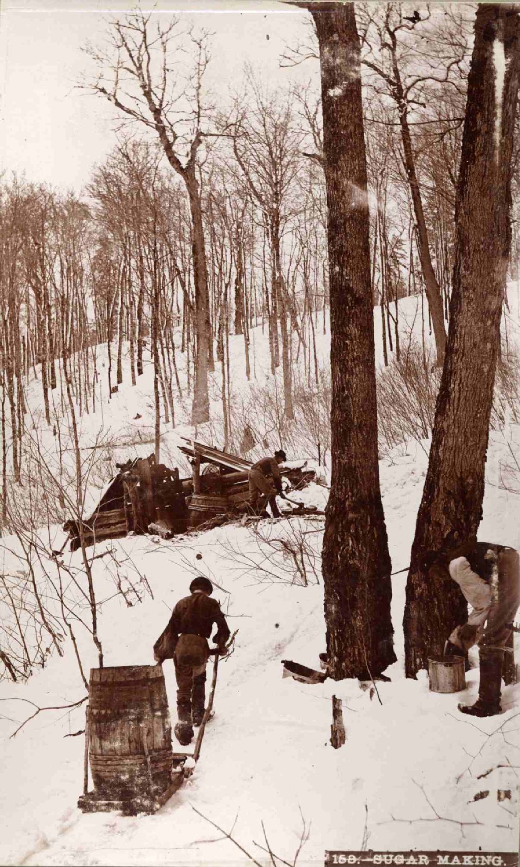 Vue des installations d'une érablière, [vers 1900], Archives nationales à Québec, Fonds J. E. Livernois Ltée, (03Q,P560,S1,P158), Photographe non identifié.