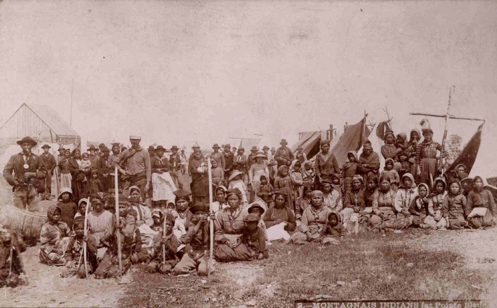 Vue éloignée d'un groupe de Montagnais à la réserve indienne de Mashteuiatsh, Pointe-Bleue, [vers 1900], Archives nationales à Québec, Fonds J. E. Livernois Ltée, (03Q,P560,S1,P2), Photographe non identifié.