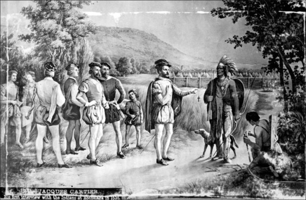 Reproduction photographique d'une gravure représentant la première rencontre entre Jacques Cartier et les Amérindiens de Hochelaga en 1535, [vers 1900], Archives nationales à Québec, Fonds J. E. Livernois Ltée, (03Q,P560,S1,P241), Photographe non identifié.