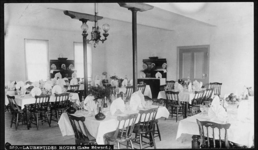 Intérieur de la Laurentides House au Lac-Édouard, [vers 1900], Archives nationales à Québec, Fonds J. E. Livernois Ltée, (03Q,P560,S1,P250), Photographe non identifié.