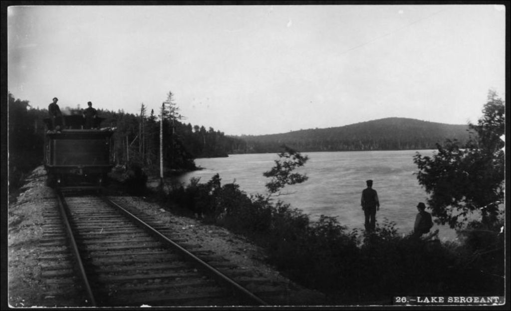 Voie ferrée sur les berges du lac Sergent, [vers 1900], Archives nationales à Québec, Fonds J. E. Livernois Ltée, (03Q,P560,S1,P26), Photographe non identifié.