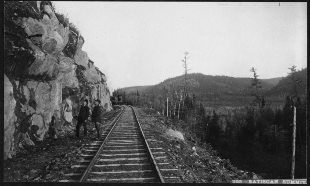 Voie ferrée au sommet de Batiscan, [vers 1900], Archives nationales à Québec, Fonds J. E. Livernois Ltée, (03Q,P560,S1,P295), Photographe non identifié.