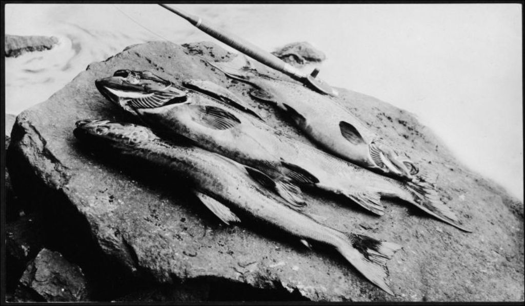 Pêche aux saumons sur la rivière Métabetchouane, [vers 1900], Archives nationales à Québec, Fonds J. E. Livernois Ltée, (03Q,P560,S1,P32), Photographe non identifié.