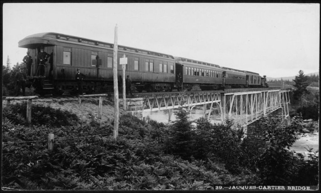 Passage du train sur le pont au-dessus de la rivière Jacques-Cartier, [vers 1900], Archives nationales à Québec, Fonds J. E. Livernois Ltée, (03Q,P560,S1,P39), Photographe non identifié.