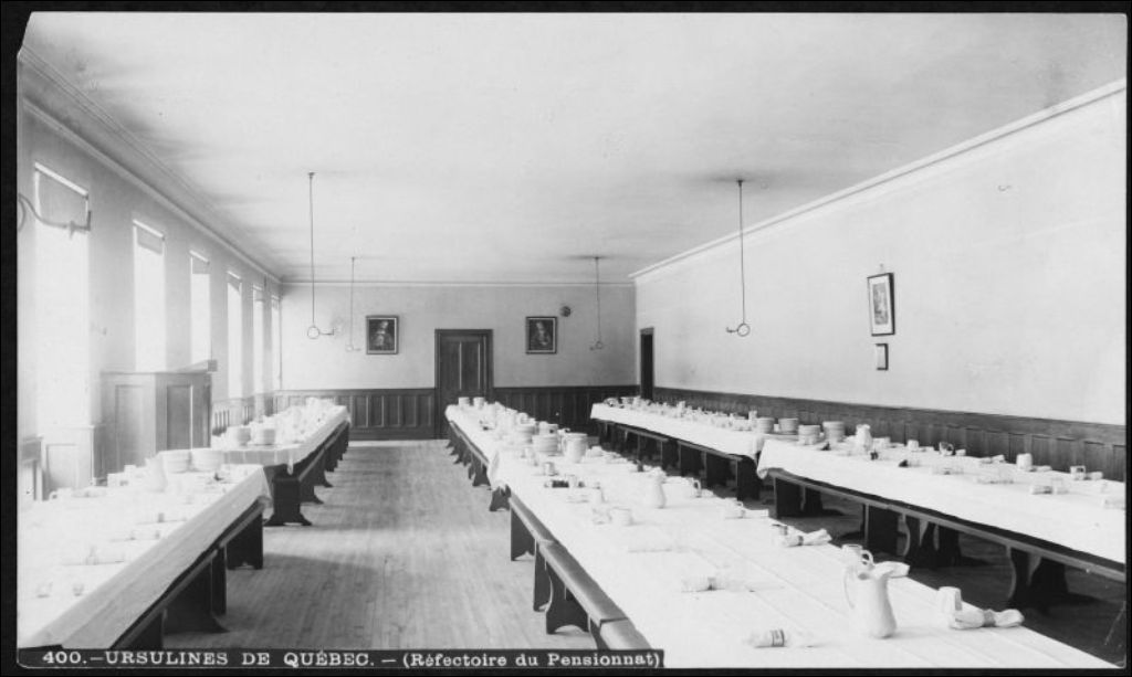 Réfectoire du pensionnat, Ursulines de Québec, [vers 1900], Archives nationales à Québec, Fonds J. E. Livernois Ltée, (03Q,P560,S1,P400), Photographe non identifié.