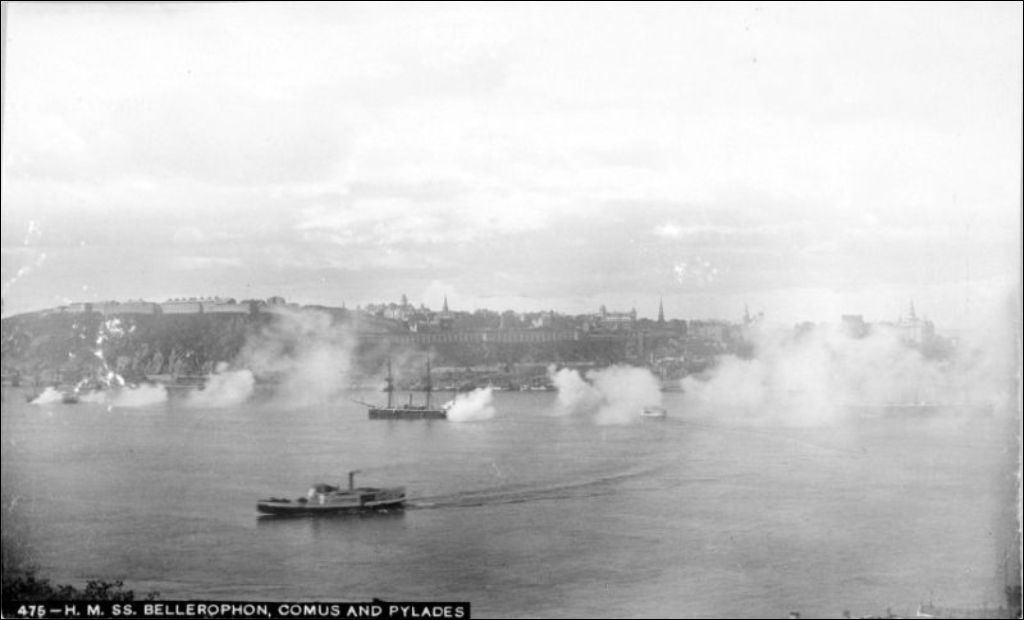 Navires H. M. SS. Bellerophon, Comus et Pylade sur le fleuve Saint-Laurent devant Québec, [vers 1890], Archives nationales à Québec, Fonds J. E. Livernois Ltée, (03Q,P560,S1,P475), Photographe non identifié.