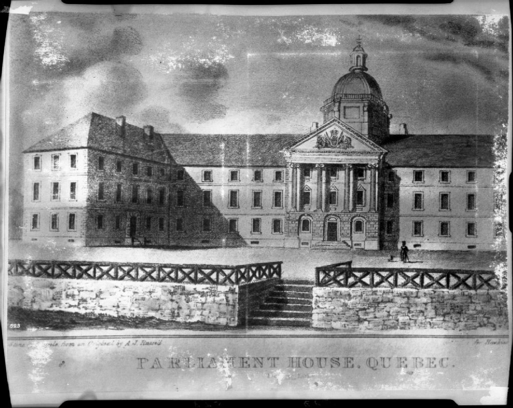 Reproduction photographique d'une lithographie représentant l'édifice du Parlement de Québec, [Vers 1830], Archives nationales à Québec, Fonds J. E. Livernois Ltée, (03Q,P560,S1,P523), Photographe non identifié.