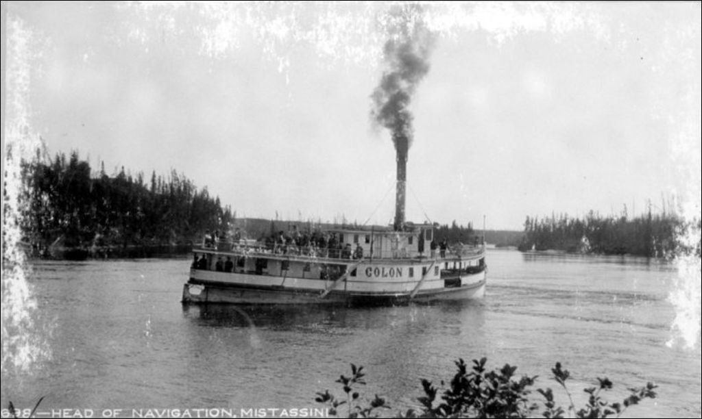 Navire de passagers "Colon" en pleine vapeur sur la rivière Mistassini, [vers 1900], Archives nationales à Québec, Fonds J. E. Livernois Ltée, (03Q,P560,S1,P698), Photographe non identifié.