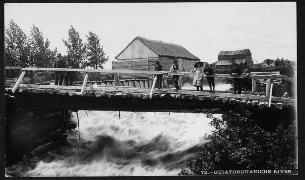 Pont traversant la rivière Ouiatchouaniche, [vers 1900], Archives nationales à Québec, Fonds J. E. Livernois Ltée, (03Q,P560,S1,P72), Photographe non identifié.