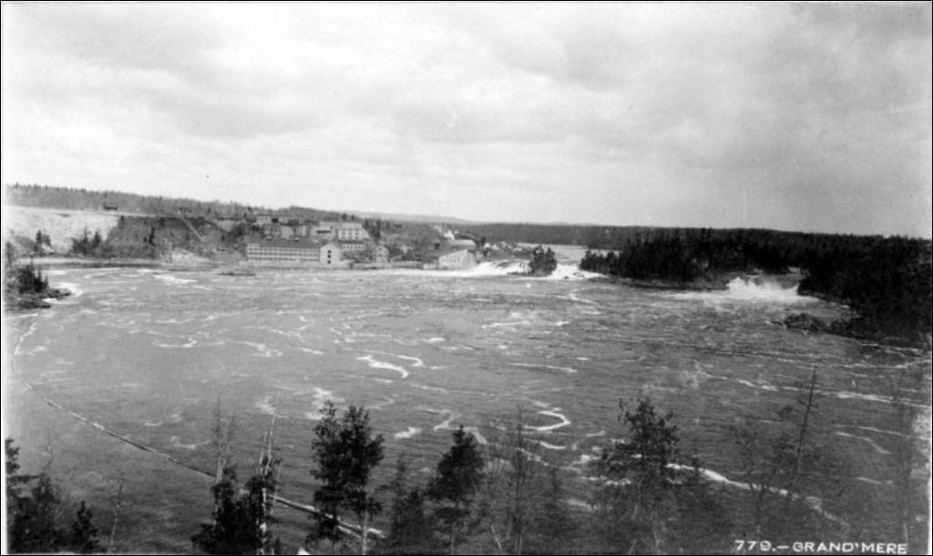Vue éloignée de l'usine de la Laurentide Paper Co, rivière Grand-Mère, [vers 1900], Archives nationales à Québec, Fonds J. E. Livernois Ltée, (03Q,P560,S1,P779), Photographe non identifié.