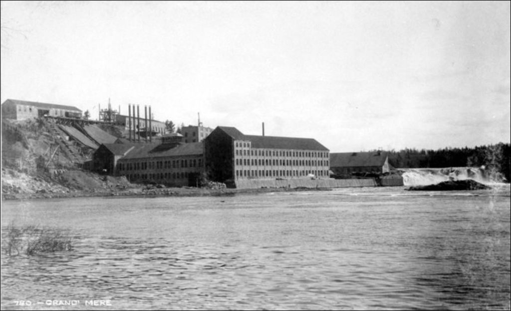 Vue de l'usine de la Laurentide Paper Co, rivière Grand-Mère, [vers 1900], Archives nationales à Québec, Fonds J. E. Livernois Ltée, (03Q,P560,S1,P780), Photographe non identifié.