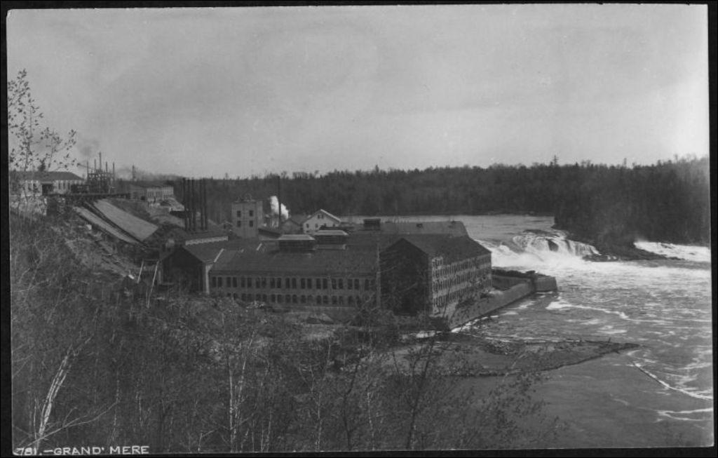 Vue de l'usine de la Laurentide Paper Co, rivière Grand-Mère, [vers 1900], Archives nationales à Québec, Fonds J. E. Livernois Ltée, (03Q,P560,S1,P781), Photographe non identifié.