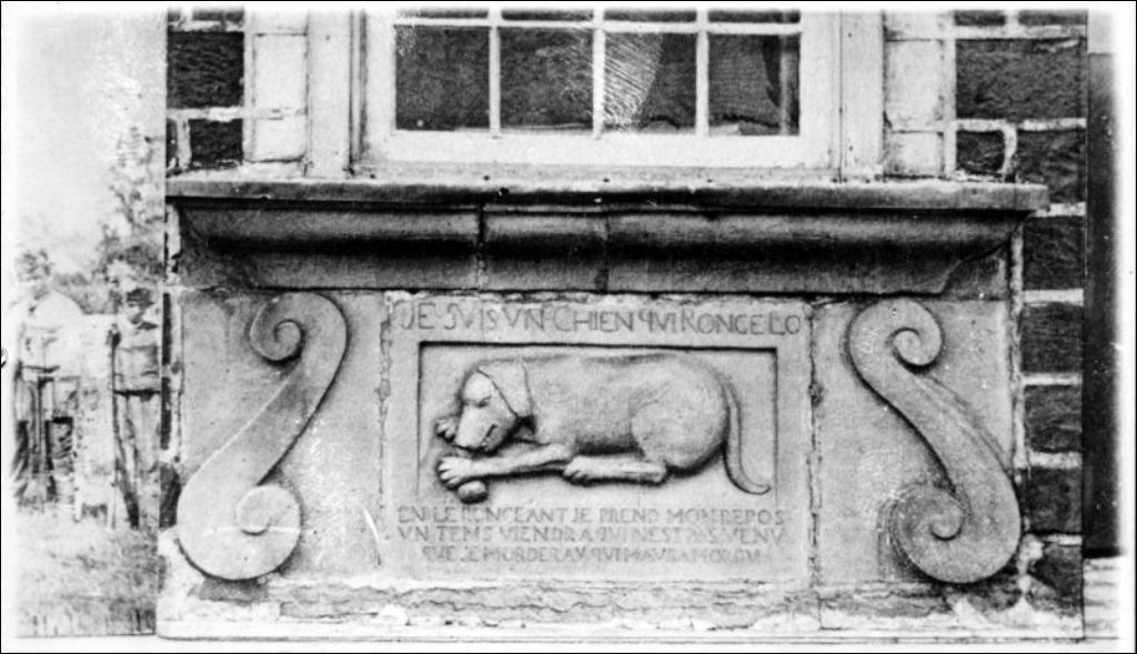 Pierre sculptée "Je suis un chien qui ronge l'os..." au fronton de l'édifice du bureau de Poste, [vers 1880], Archives nationales à Québec, Fonds J. E. Livernois Ltée, (03Q,P560,S2,D2,P10441), Photographe non identifié.