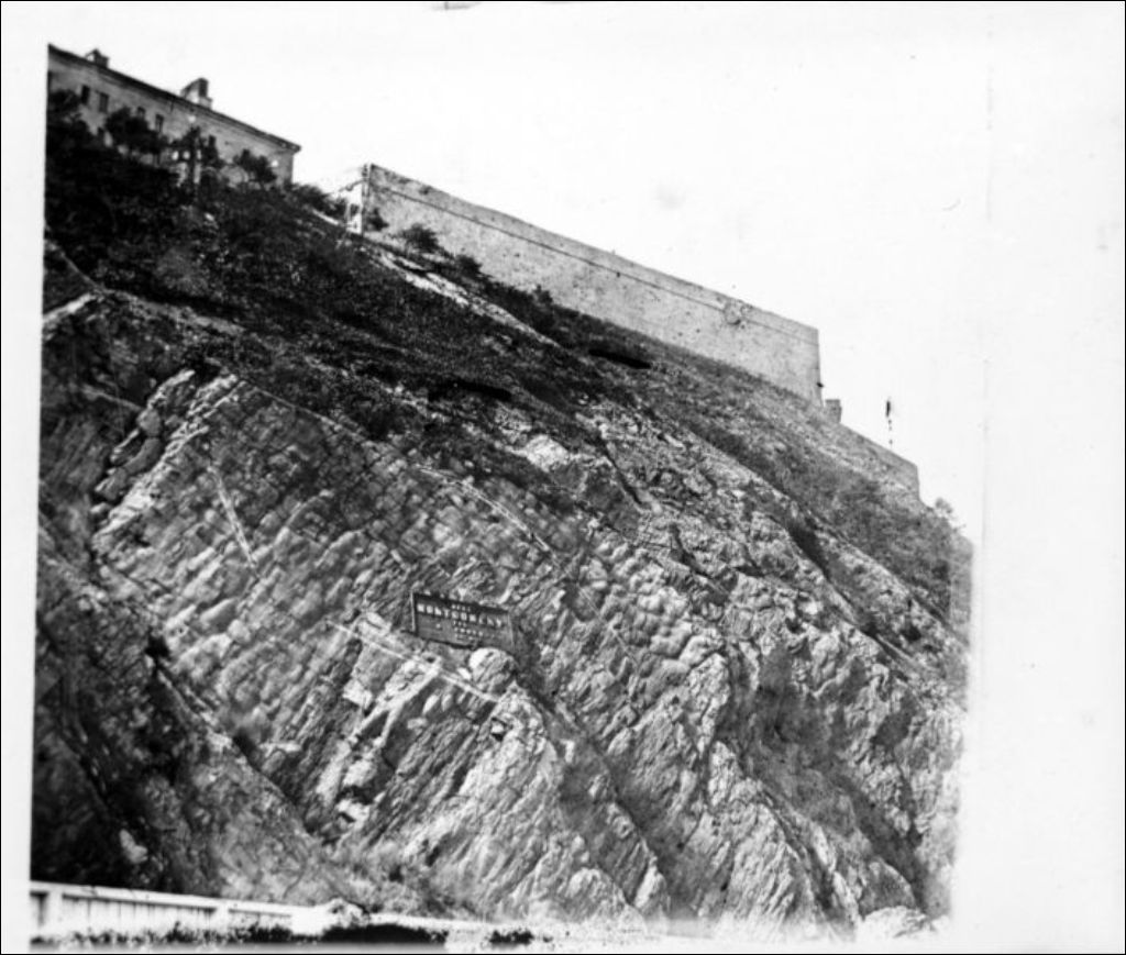 Vue sur la plaque commémorative sur la chute de Montgomery (1775), [vers 1880], Archives nationales à Québec, Fonds J. E. Livernois Ltée, (03Q,P560,S2,D2,P11252), Photographe non identifié.