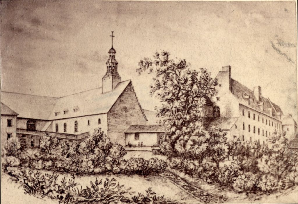 Reproduction photographique d'un dessin du monastère des Ursulines de Québec, [Vers 1880], Archives nationales à Québec, Fonds J. E. Livernois Ltée, (03Q,P560,S2,D2,P11436), Photographe non identifié.