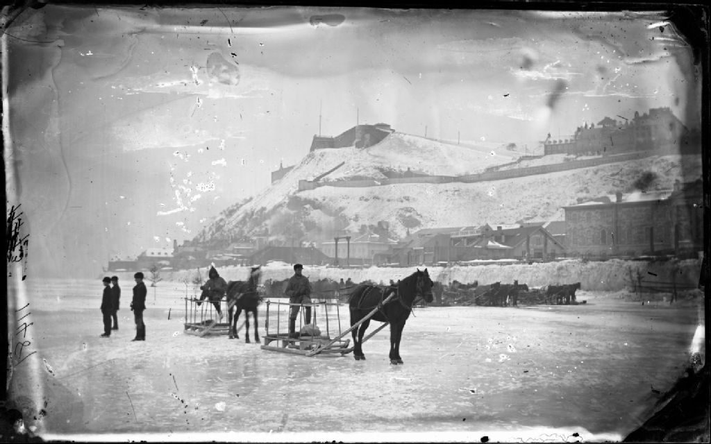 Transport par hippomobile sur le pont de glace du fleuve Saint-Laurent, [Vers 1900], Archives nationales à Québec, Fonds J. E. Livernois Ltée, (03Q,P560,S2,D2,P11481), Photographe non identifié.