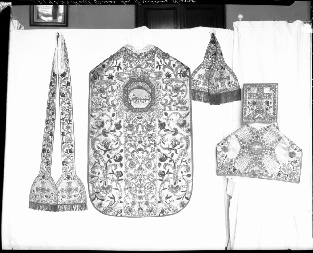 Ornements brodés (d'après la tradition) par la reine Anne d'Autriche à l'hôpital Hôtel-Dieu du Précieux Sang de Québec, [Vers 1925], Archives nationales à Québec, Fonds J. E. Livernois Ltée, (03Q,P560,S2,D2,P121923-3), Photographe non identifié.