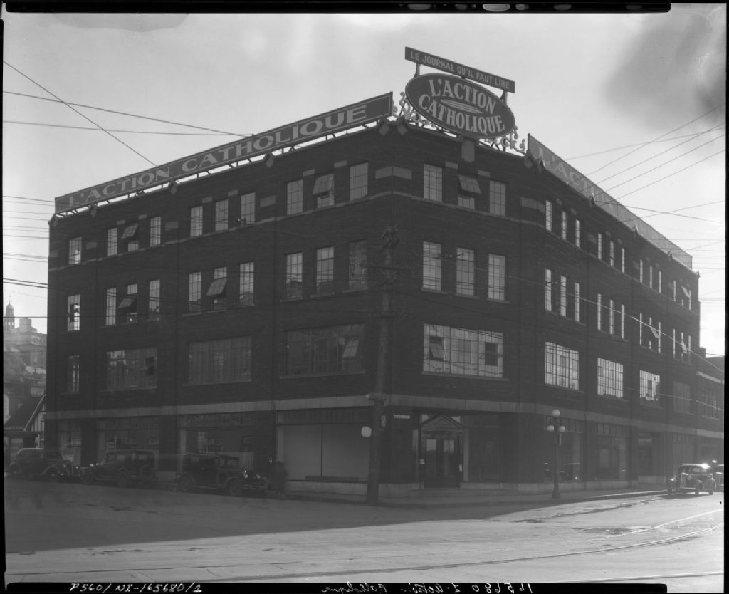 Édifice de L'Action Catholique, quartier Saint-Roch, 1936, Archives nationales à Québec, Fonds J. E. Livernois Ltée, (03Q,P560,S2,D2,P165680-1), Photographe non identifié.