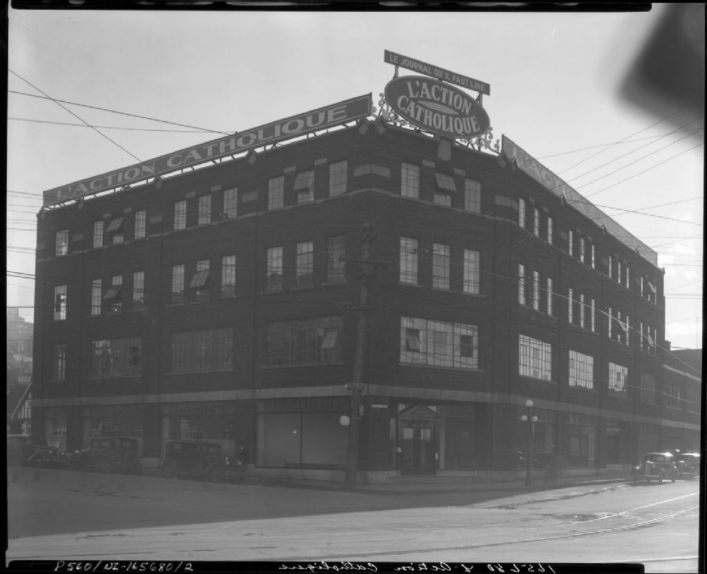 Édifice de L'Action Catholique, quartier Saint-Roch, 1936, Archives nationales à Québec, Fonds J. E. Livernois Ltée, (03Q,P560,S2,D2,P165680-2), Photographe non identifié.