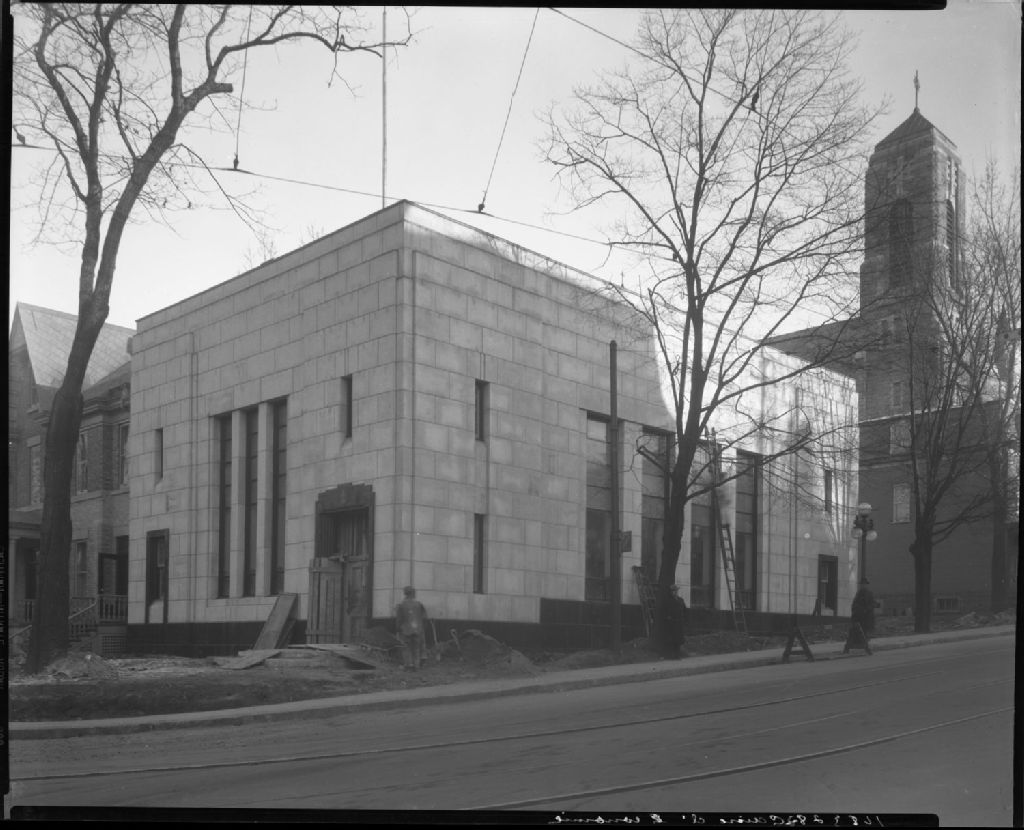 Construction de La Caisse d'Économie de Québec à l'angle du chemin Sainte-Foy et de l'avenue des Érables, 1937, Archives nationales à Québec, Fonds J. E. Livernois Ltée, (03Q,P560,S2,D2,P168328-2), Photographe non identifié.
