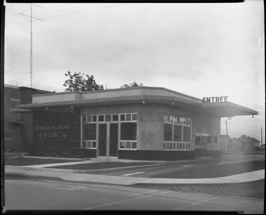 Vue extérieure de la Banque d'Économie de Québec, 1954, Archives nationales à Québec, Fonds J. E. Livernois Ltée, (03Q,P560,S2,D2,P226970-2), Photographe non identifié.