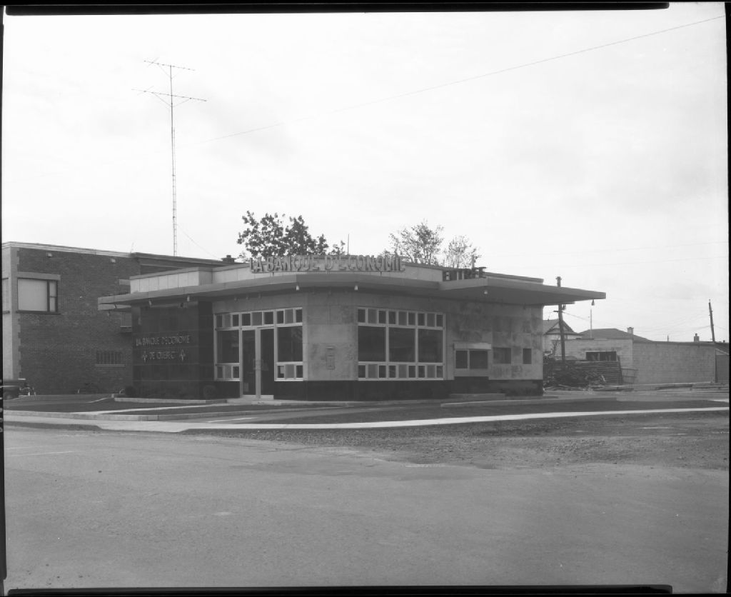 Vue extérieure de la Banque d'Économie de Québec, 1954, Archives nationales à Québec, Fonds J. E. Livernois Ltée, (03Q,P560,S2,D2,P226970-5), Photographe non identifié.