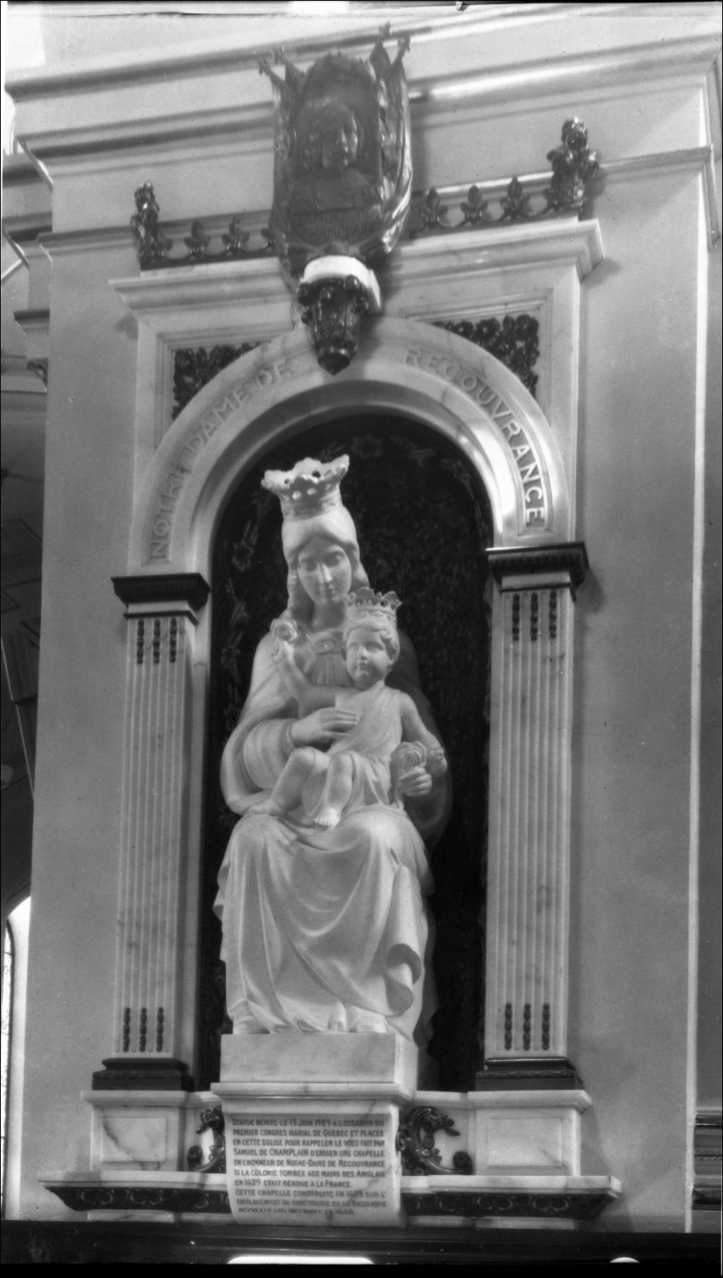 Statue de Notre-Dame de Recouvrance à l'intérieur de la basilique-cathédrale Notre-Dame-de-Québec, [vers 1925], Archives nationales à Québec, Fonds J. E. Livernois Ltée, (03Q,P560,S2,D2,P300240), Photographe non identifié.