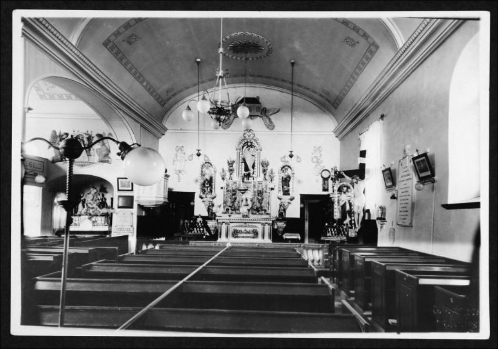 Intérieur de la chapelle des Hurons de Wendake, [vers 1880], Archives nationales à Québec, Fonds J. E. Livernois Ltée, (03Q,P560,S2,D2,P300348), Photographe non identifié.