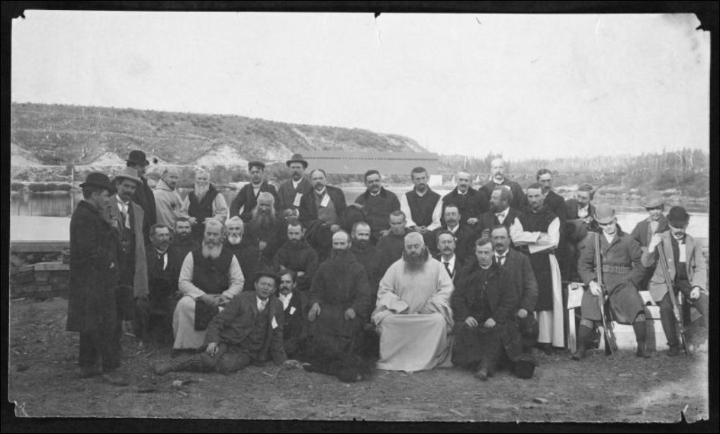Photo de groupe avec Lomer Gouin, des civils et les Révérends Pères Trappistes lors d'une visite officielle à la Trappe de Notre-Dame de Mistassini ., [vers 1910], Archives nationales à Québec, Fonds J. E. Livernois Ltée, (03Q,P560,S2,D2,P300351), Photographe non identifié.