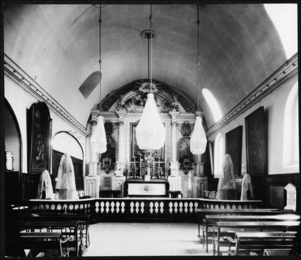 Intérieur de la chapelle de l'Hôpital Général, quartier Saint-Sauveur, [vers 1880], Archives nationales à Québec, Fonds J. E. Livernois Ltée, (03Q,P560,S2,D2,P300395), Photographe non identifié.