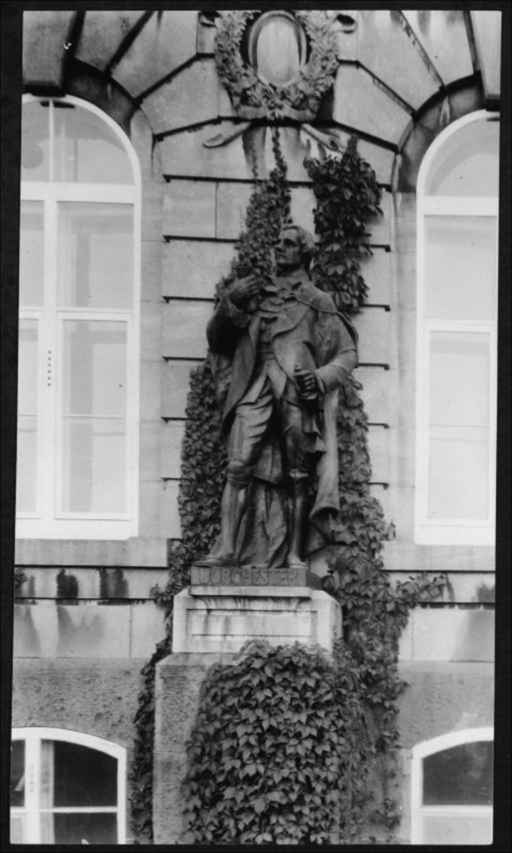 Statue de Sir Guy Carleton baron de Dorschester devant le Parlement de Québec, [vers 1920], Archives nationales à Québec, Fonds J. E. Livernois Ltée, (03Q,P560,S2,D2,P300396-1), Photographe non identifié.