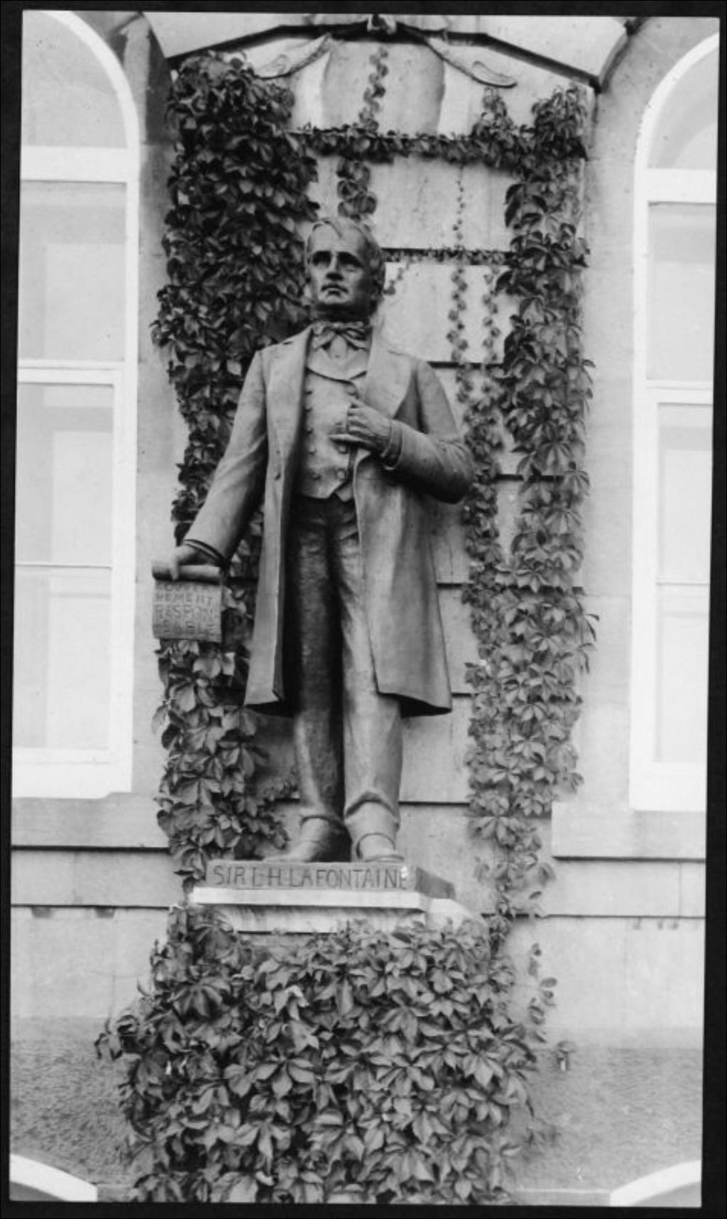 Statue de Sir Louis-Hippolyte Lafontaine devant le Parlement de Québec, [vers 1920], Archives nationales à Québec, Fonds J. E. Livernois Ltée, (03Q,P560,S2,D2,P300396-2), Photographe non identifié.