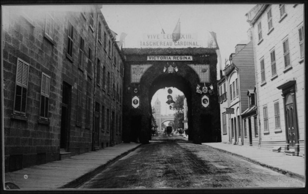 Arche décorative "Vive Leon XIII - Taschereau Cardinal - Victoria Regina" érigée pour le retour de Rome de monseigneur Louis-Elzéar-Alexandre Taschereau qui a été fait cardinal ., 1886, Archives nationales à Québec, Fonds J. E. Livernois Ltée, (03Q,P560,S2,D2,P300397-1), Photographe non identifié.