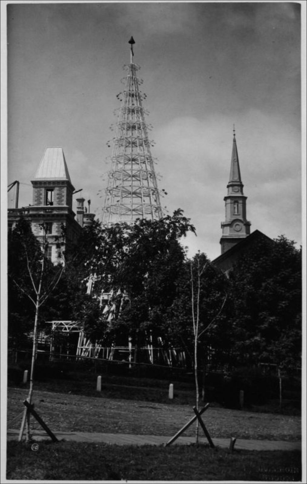 Vue éloignée d'une pyramide en bois pour illumination sur le jet d'eau du Rond de chaînes, près du Palais de Justice en chantier de construction, pour le retour de Rome de monseigneur Louis-Elzéar-Alexandre Taschereau, fait cardinal