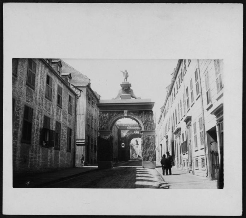 Arches décoratives érigée pour le retour de Rome de monseigneur Louis-Elzéar-Alexandre Taschereau qui a été fait cardinal ., 1886, Archives nationales à Québec, Fonds J. E. Livernois Ltée, (03Q,P560,S2,D2,P300397-8), Photographe non identifié.