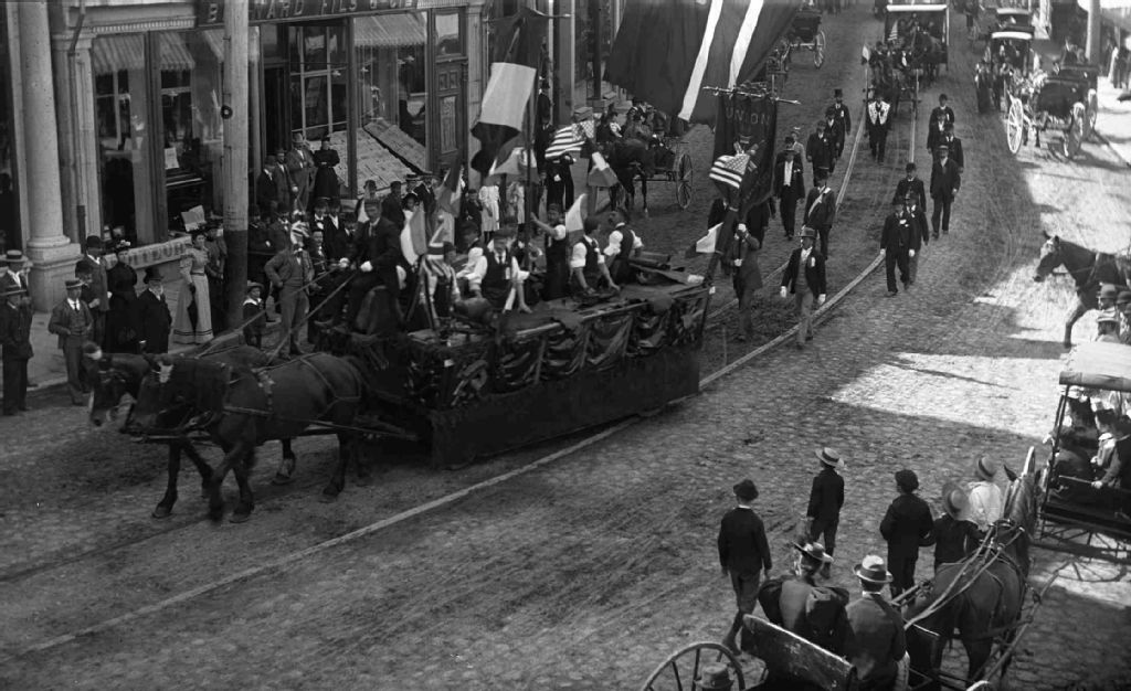 Défilé sur la rue Saint-Jean à l'occasion de la fête du travail, 1895, Archives nationales à Québec, Fonds J. E. Livernois Ltée, (03Q,P560,S2,D2,P79312-2), Photographe non identifié.