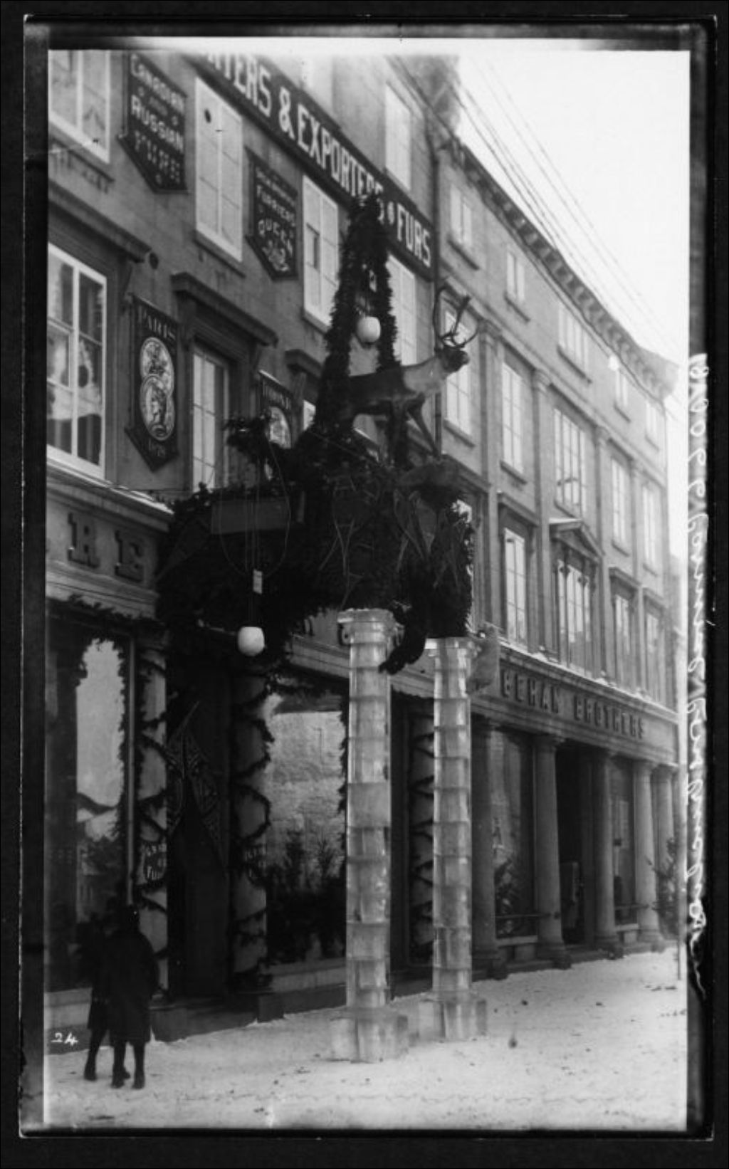 Vue éloignée d'un monument de glace à la porte d'accès principale au magasin "G. R. Renfrew & Co. - George R. Renfrew et John Holt, chapeliers et manchonniers", et près de l'édifice "Behan Bros. - Andrew J. Behan, importateurs de nouveautés"