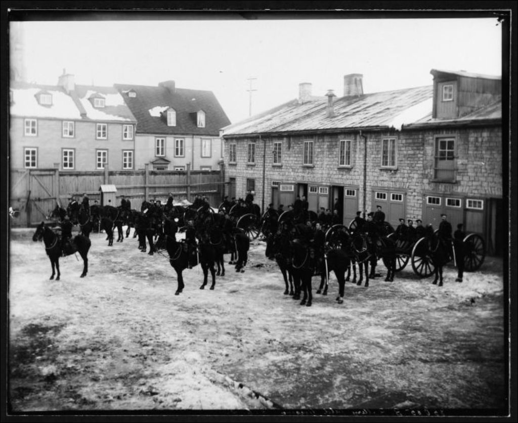 Démonstration militaire devant le Royal Canadian Artillery, [vers 1890], Archives nationales à Québec, Fonds J. E. Livernois Ltée, (03Q,P560,S2,D2,P85085), Photographe non identifié.