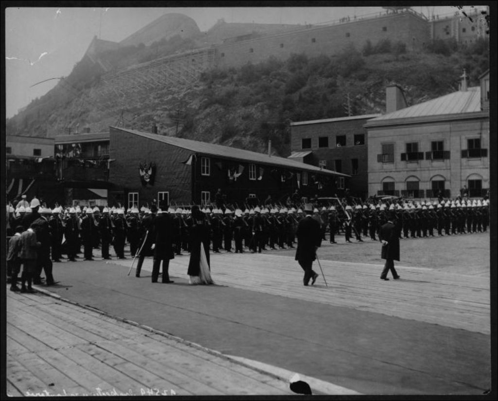 Revue militaire au quai de la Reine à l'occasion des fêtes du Tricentenaire, 1908, Archives nationales à Québec, Fonds J. E. Livernois Ltée, (03Q,P560,S2,D2,P92549), Photographe non identifié.