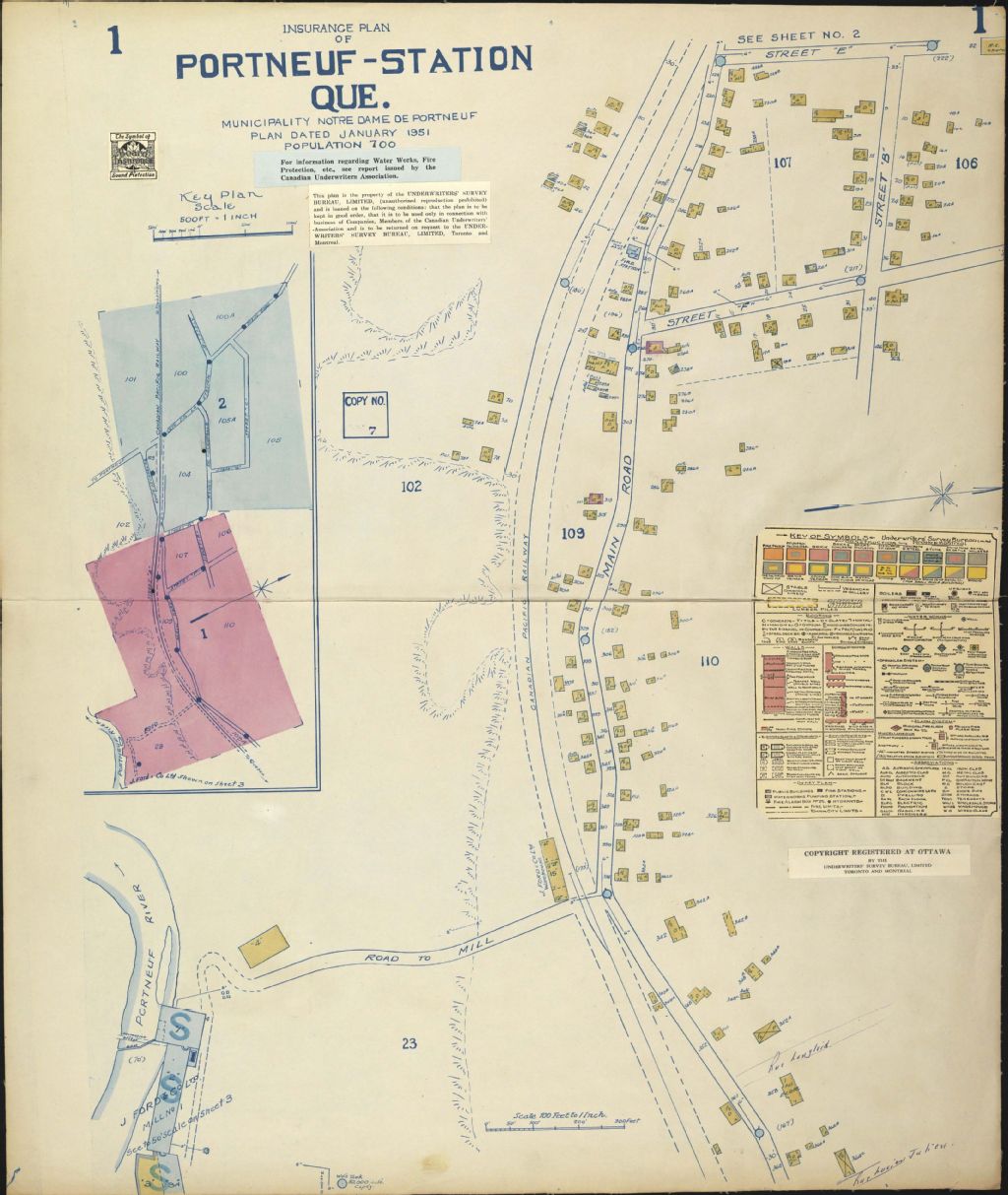 - Sur les plans d'assurance-incendie du village de Portneuf-Station figurent les rues et leurs noms, les numéros civiques, les bâtiments et les industries. Nous y retrouvons également le tracé de la rivière Portneuf. Le repérage de l'endroit recherché est facilité par un plan d'ensemble. Une légende donne la signification des couleurs et des symboles utilisés