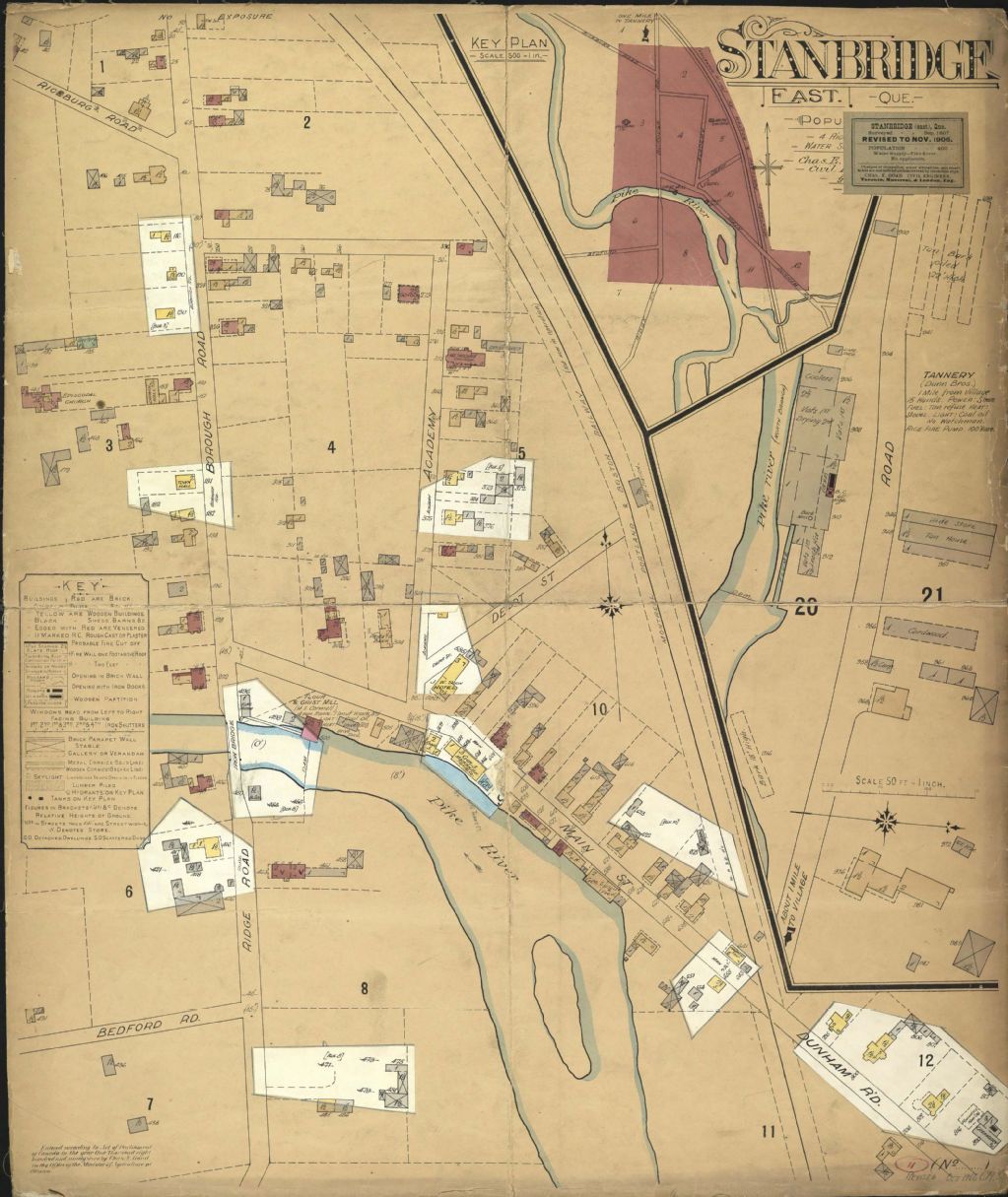 Sur ce plan d'assurance-incendie de la municipalité de Stanbridge East figurent les rues et leurs noms, les numéros civiques, les bâtiments et les industries telles que M.S. Cormell Flour & Grist Mill et Tannery Dunn Bros. Nous y retrouvons également le tracé de la rivière aux Brochets (Pike) et l¿emplacement de l¿hôtel J.W. Dion. Le repérage de l'endroit recherché est facilité par un plan d'ensemble. Une légende donne la signification des couleurs et des symboles utilisés