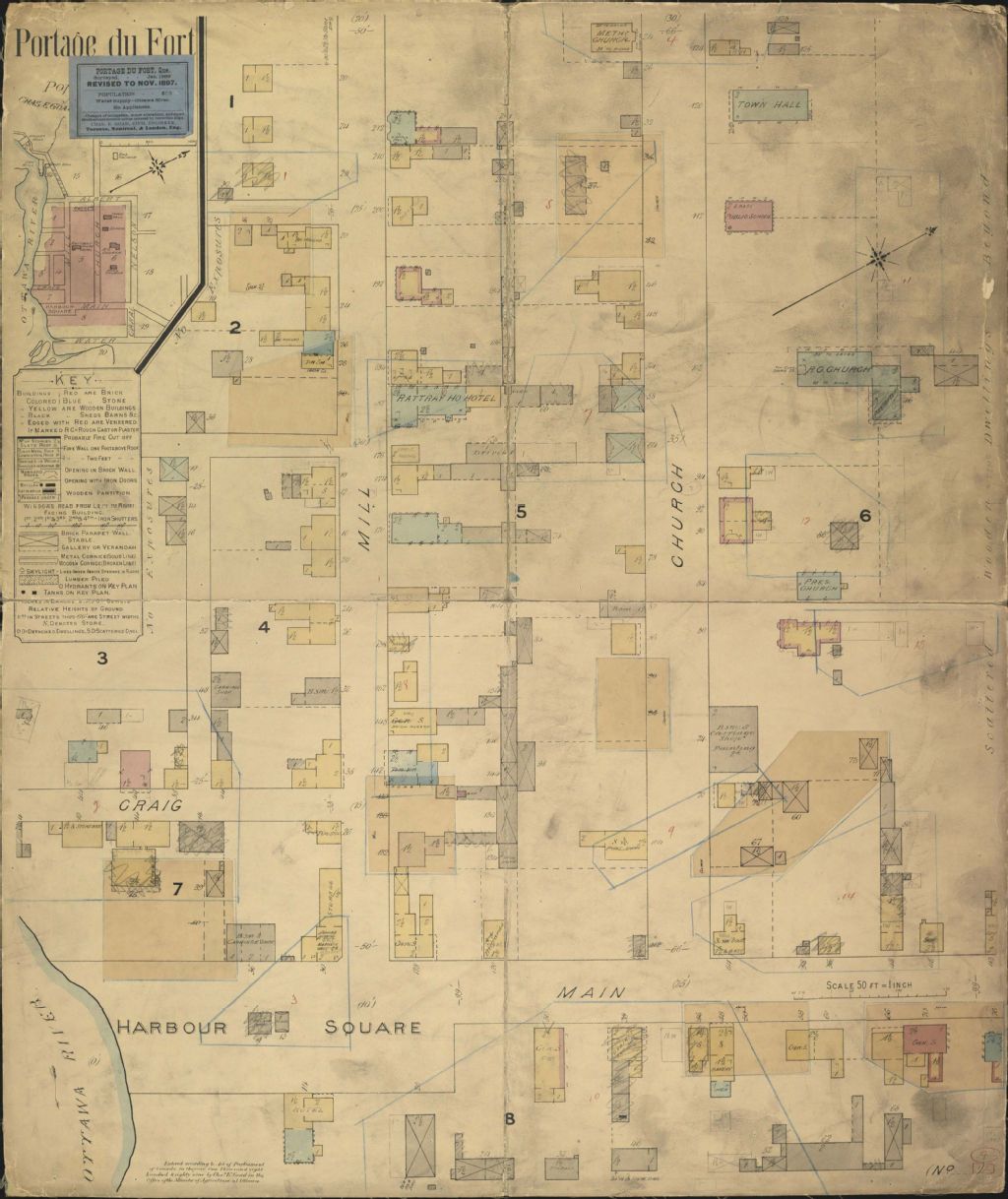Sur ce plan d'assurance-incendie de la municipalité de Portage-du-Fort figurent les rues et leurs noms, les numéros civiques, les bâtiments, les industries. Nous y retrouvons également le tracé de la rivière des Outaouais. Le repérage de l'endroit recherché est facilité par un plan d'ensemble. Une légende donne la signification des couleurs et des symboles utilisés