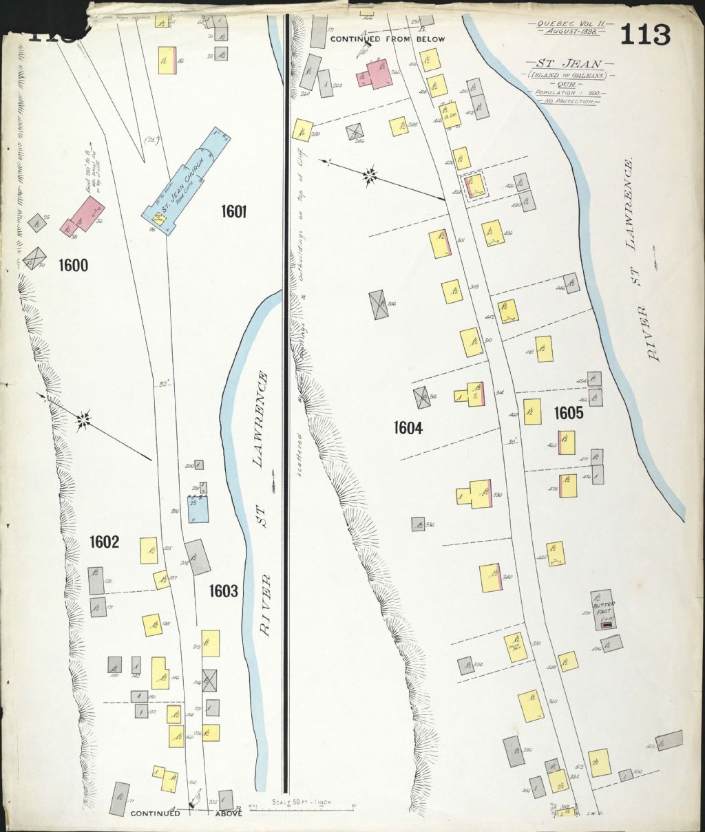 Sur ce plan d'assurance-incendie de la municipalité de Saint-Jean, Ile d¿Orléans, figurent les rues et leurs noms, les numéros civiques, les bâtiments et les industries. Nous y retrouvons également le tracé du fleuve Saint-Laurent. Une légende donne la signification des couleurs et des symboles utilisés