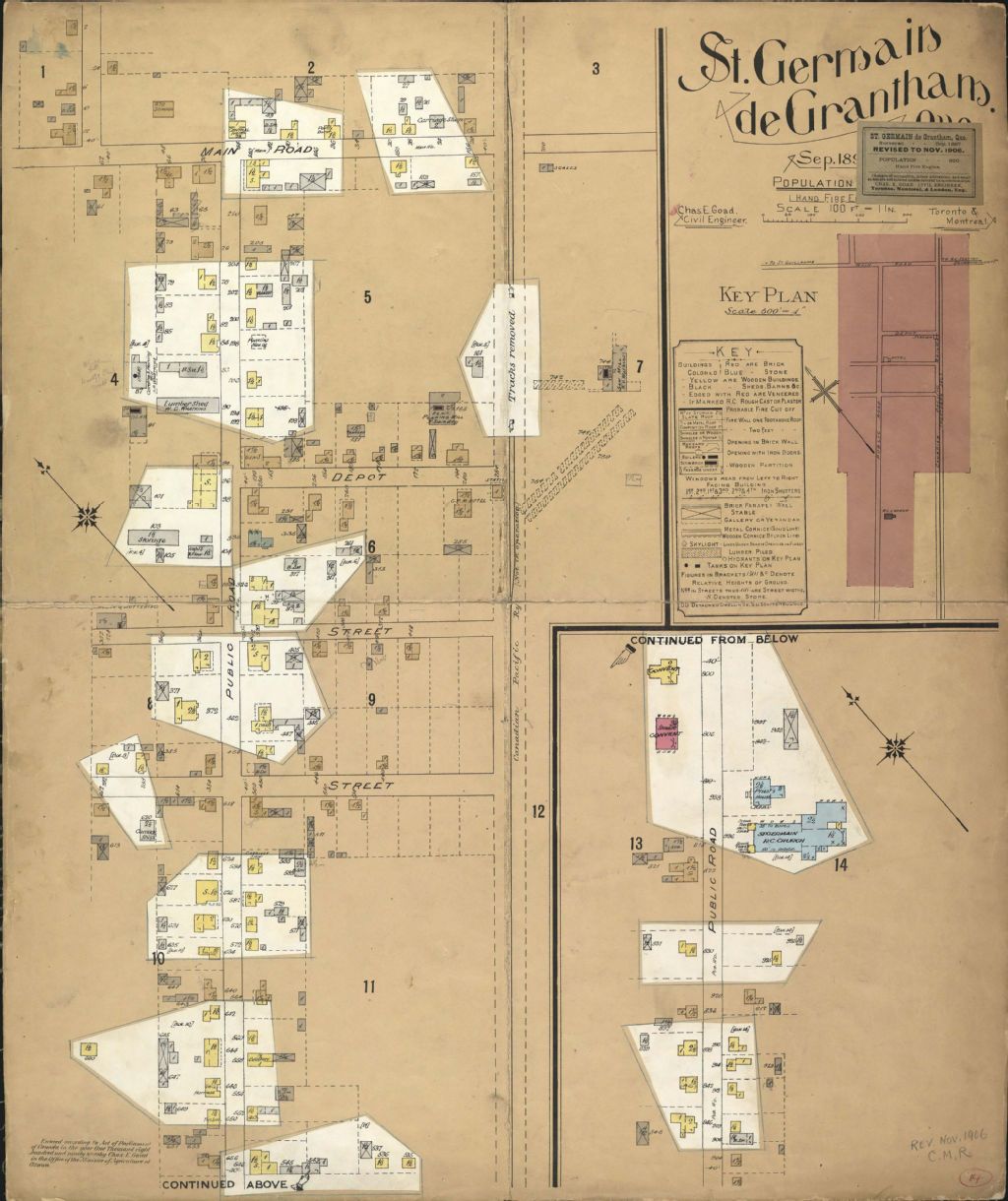 Sur ce plan d'assurance-incendie de la municipalité de Saint-Germain-de-Grantham figurent les rues et leurs noms, les numéros civiques, les bâtiments et les industries. Le repérage de l'endroit recherché est facilité par un plan d'ensemble. Une légende donne la signification des couleurs et des symboles utilisés