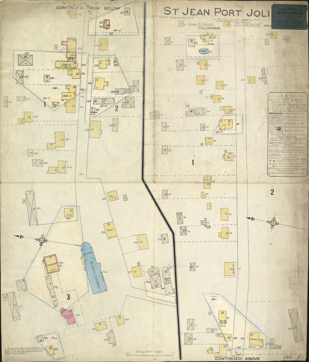 Sur ce plan d'assurance-incendie de la municipalité de Saint-Jean-Port-Joli figurent les rues et leurs noms, les numéros civiques, les bâtiments et les industries. Une légende donne la signification des couleurs et des symboles utilisés