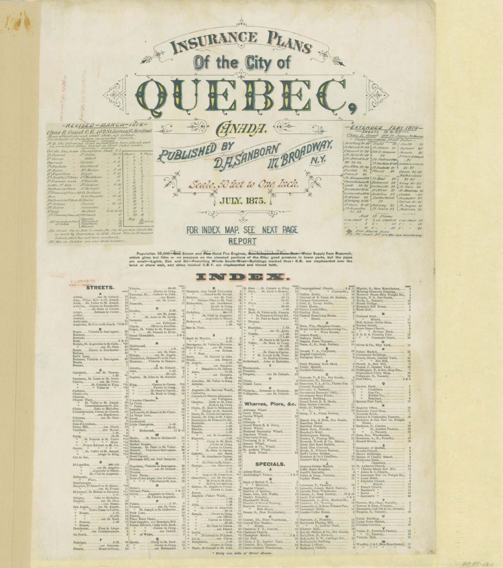 - Sur ces plans d'assurance-incendie de la ville de Québec figurent les rues et leurs noms, les numéros civiques, les bâtiments et les industries. Le repérage de l'endroit recherché est facilité par un plan d'ensemble. Une légende donne la signification des couleurs et des symboles utilisés.La précédente cote de ce document est: 342-Québec-1875