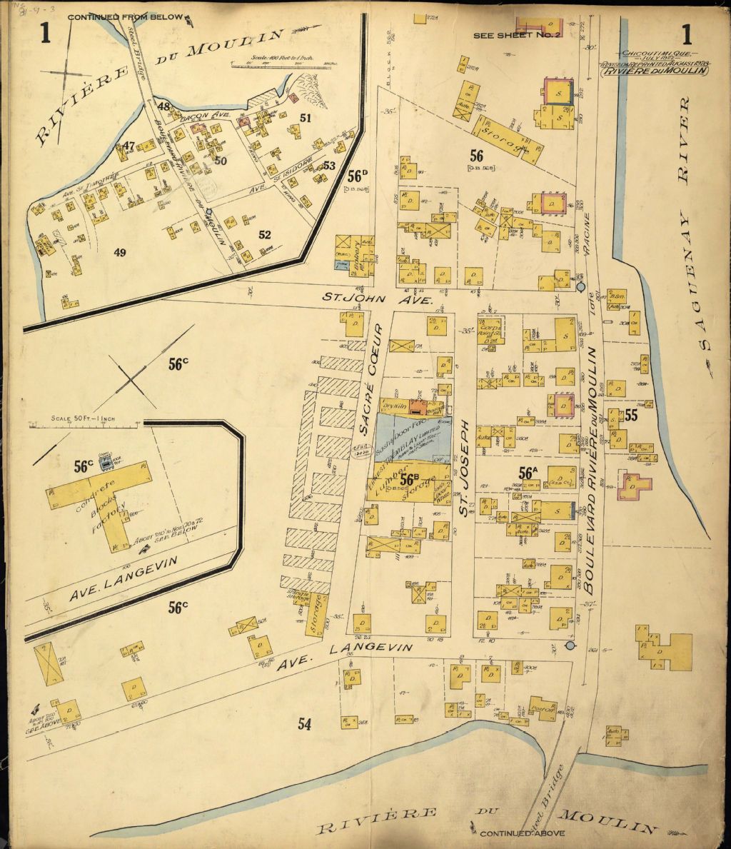 - Sur ces plans d'assurance-incendie de la ville de Chicoutimi et du village Rivière du Moulin figurent les rues et leurs noms, les numéros civiques, les bâtiments et l'emplacement de Quebec Pulp & Paper Corporation. Nous y retrouvons également le tracé de la rivière du Moulin et de la rivière aux Rats. Le repérage de l'endroit recherché est facilité par un plan d'ensemble. Une légende donne la signification des couleurs et des symboles utilisés