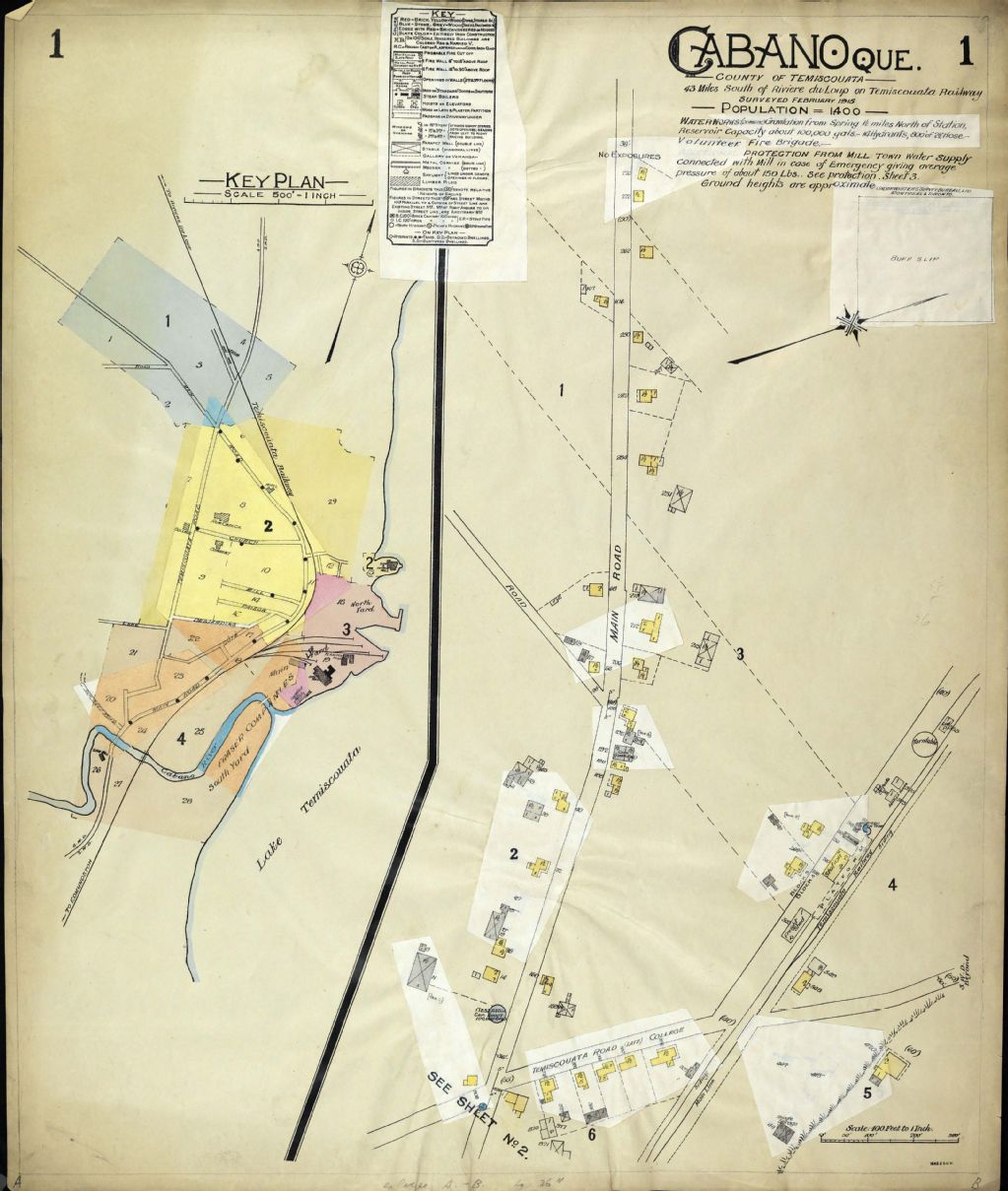 - Sur ces plans d'assurance-incendie de la ville de Cabano figurent les rues et leurs noms, les numéros civiques et les bâtiments. Nous y retrouvons également le tracé du lac Témiscouata. Le repérage de l'endroit recherché est facilité par un plan d'ensemble. Une légende donne la signification des couleurs et des symboles utilisés