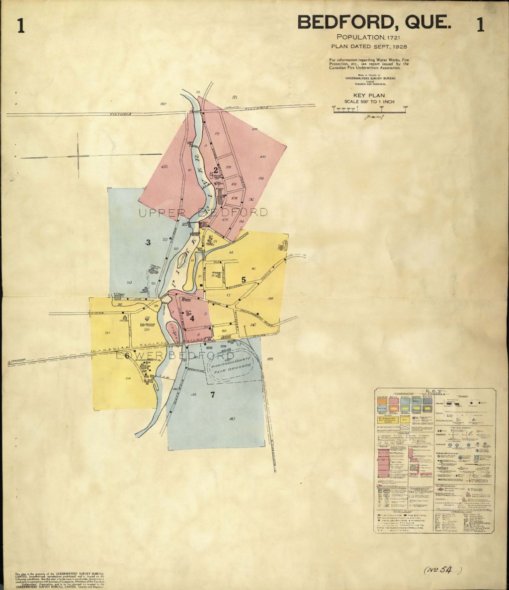 Sur ces plans d'assurance-incendie de la ville de Bedford figurent les rues et leurs noms, les numéros civiques, les bâtiments et les industries. Nous retrouvons également le tracé de la rivière aux Brochets. Le repérage de l'endroit recherché est facilité par un plan d'ensemble. Une légende donne la signification des couleurs et des symboles utilisés